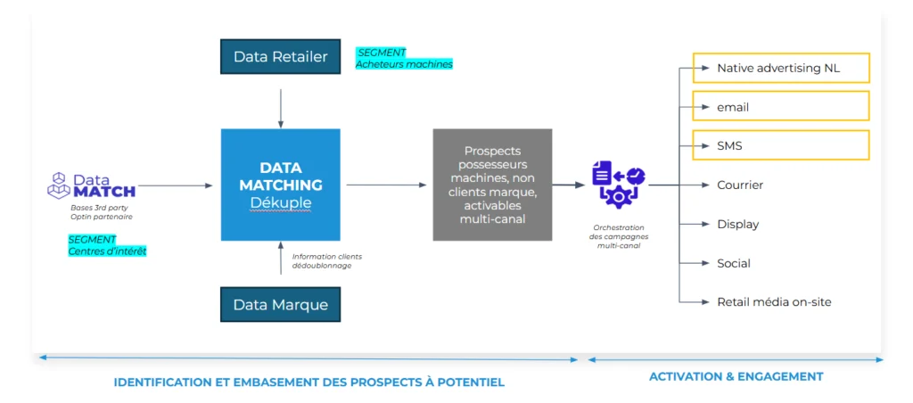 Une fois la création de segments de contacts augmentés par la Data du retail media, il est possible de mettre en place des stratégies d’activation en optimisant la combinaison des ciblages et des canaux en digital et en marketing (e-mail, sms, postal,…)
