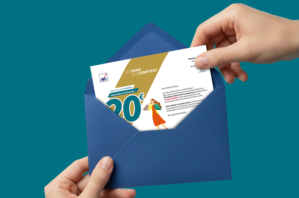 • Le dispositif permet aux agents AXA de remettre des bons cadeaux de 20 € à leurs clients particuliers, à dépenser chez des commerçants eux-mêmes clients ou prospects AXA. Une mécanique simple, qui stimule l’activité locale tout en renforçant la préférence de marque.