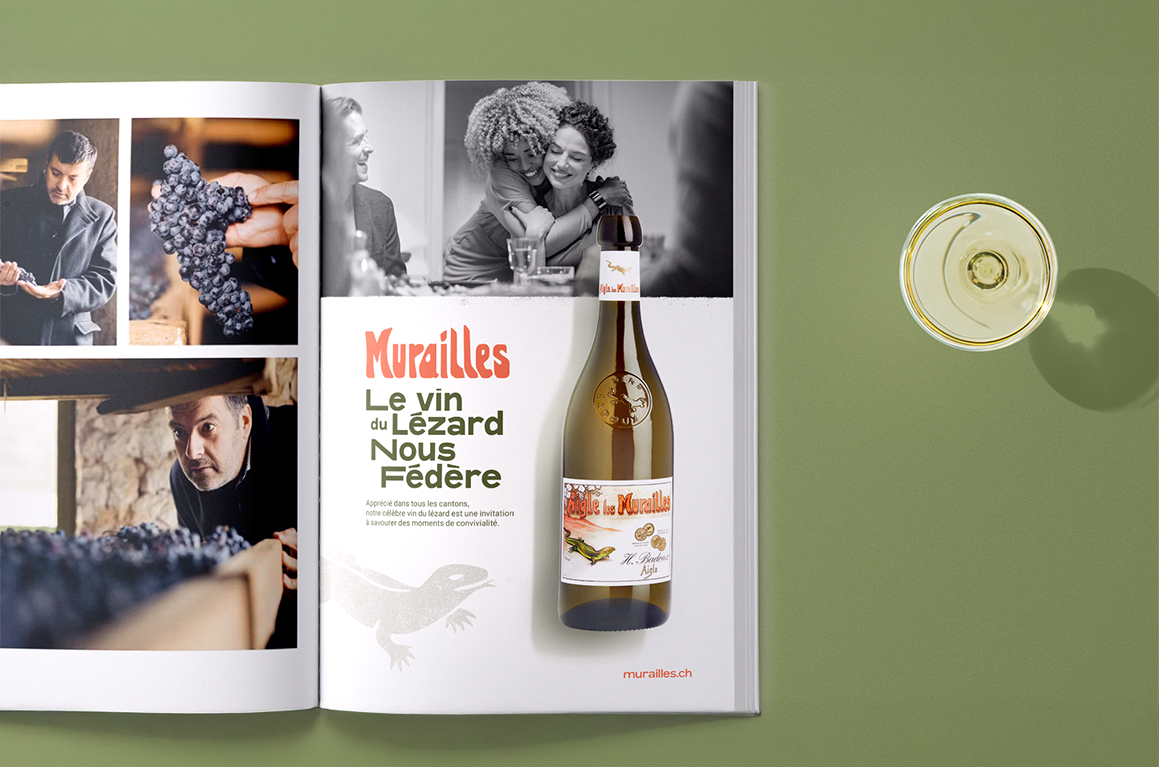 Dans l’univers du vin, les campagnes sont souvent centrées sur l’origine ou les notes gustatives. La marque Murailles a souhaité s’en affranchir pour construire une image plus émotionnelle. L’enjeu était double : développer la visibilité à l’échelle nationale en Suisse et travailler l’image à partir d’un nouveau territoire s’appuyant sur les codes de notre nouvelle plateforme de marque.